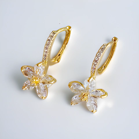 Beleza e delicadeza é o que esse brinco trás! Nossa semijoia conta com argola tendo sua superficie cravejada com pedras de zircônia e na sua ponta inferior, uma flor de cinco pétalas brilhosa.